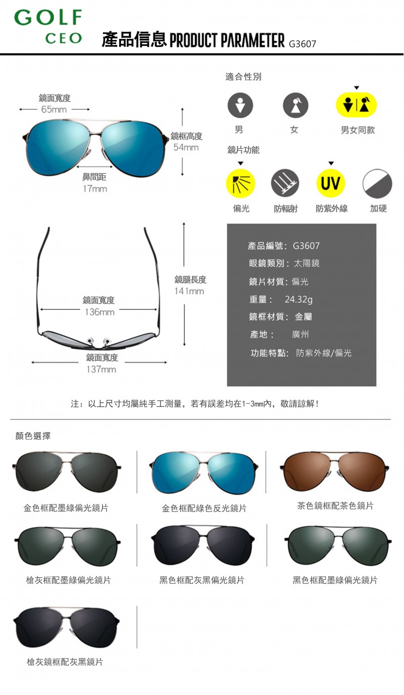 » GOLF CEO高爾夫總裁 G3607偏光太陽眼鏡男女同款