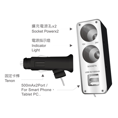 車用兩孔擴充+1A兩孔USB充電器 E-PCB059