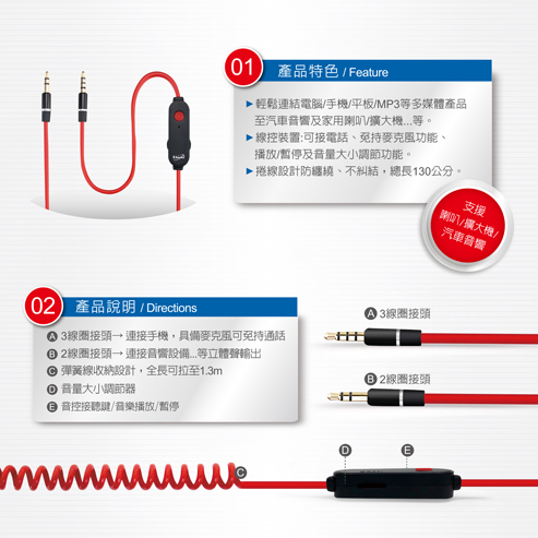 E-books X20音控接聽AUX音源傳輸線公對公3.5mm-130cmE-IPD083