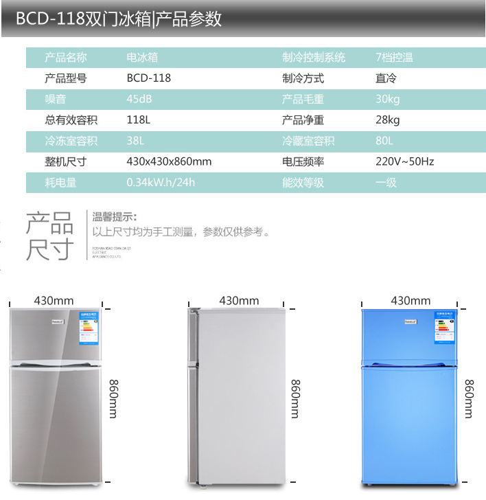 冰箱118L双门冰箱家用冷藏冷冻小型宿舍电冰箱
