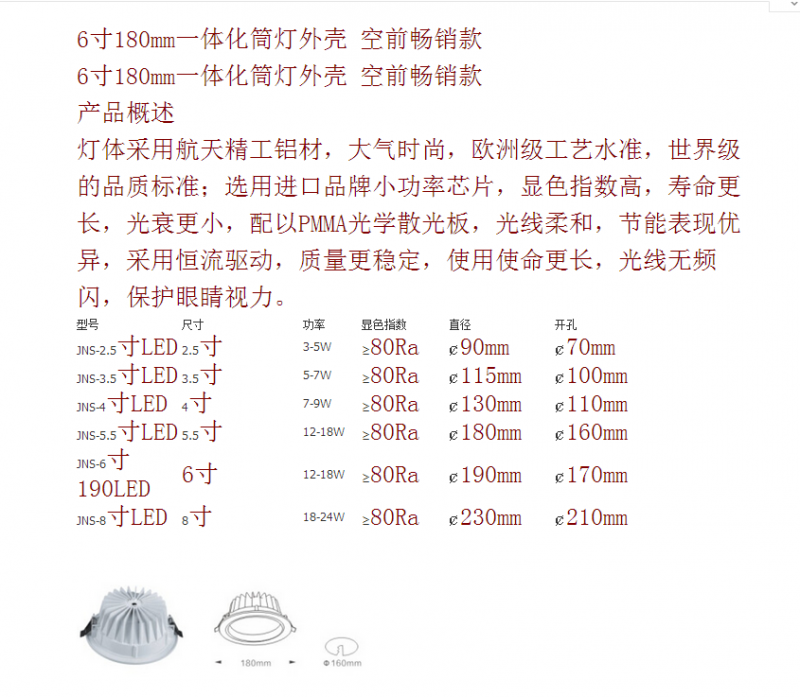» 6寸180mmLED筒灯 一体化LED天花筒灯套件