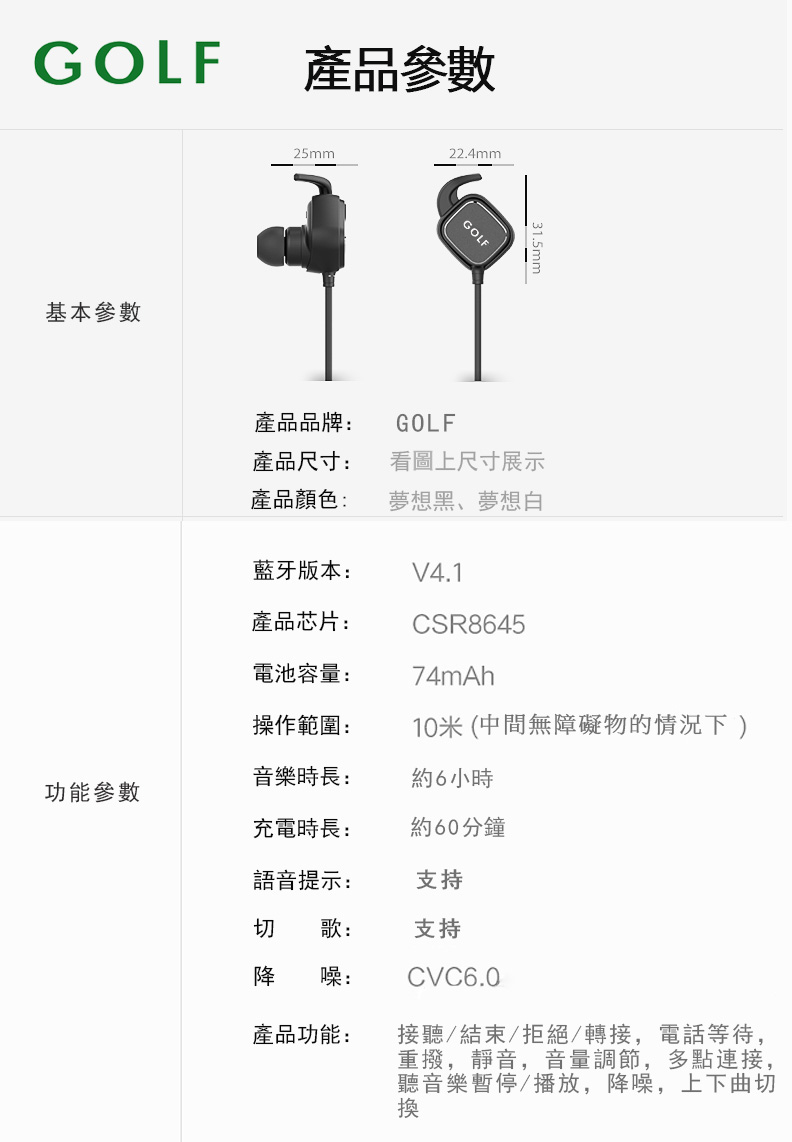 » GOLF 高爾夫 运动型蓝牙耳机G3315