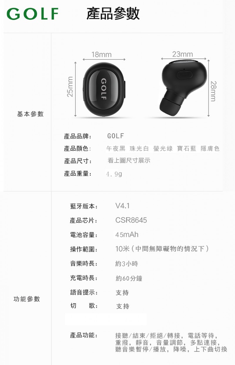 GOLF 高爾夫 耳塞式蓝牙耳机G3309