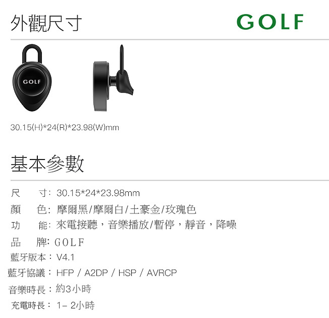 » GOLF 高爾夫 耳塞式蓝牙耳机G3310