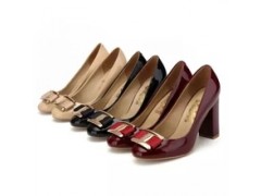 2016春夏新款粗跟中跟尖头女鞋纯色漆皮方跟韩版单鞋百搭乐福鞋女