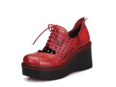2016最新款系带高跟单鞋镂空圆头防水台女鞋牛皮时尚复古鞋批发