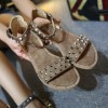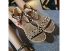 韩版一字式扣带露趾凉鞋 女夏平底铆钉休闲鞋女新款2016一件代发