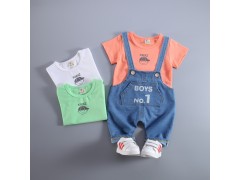 2016夏季童装 韩版中小男童短袖童装 牛仔背带儿童两件套一件代发