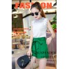 夏季精品女装新款无袖纯色网纱透视蕾丝衫蝴蝶结棉麻短裤两件套装