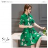 2016新款韩版 宝石绿 天鹅印花 衬衫领 收腰显瘦真丝连衣裙